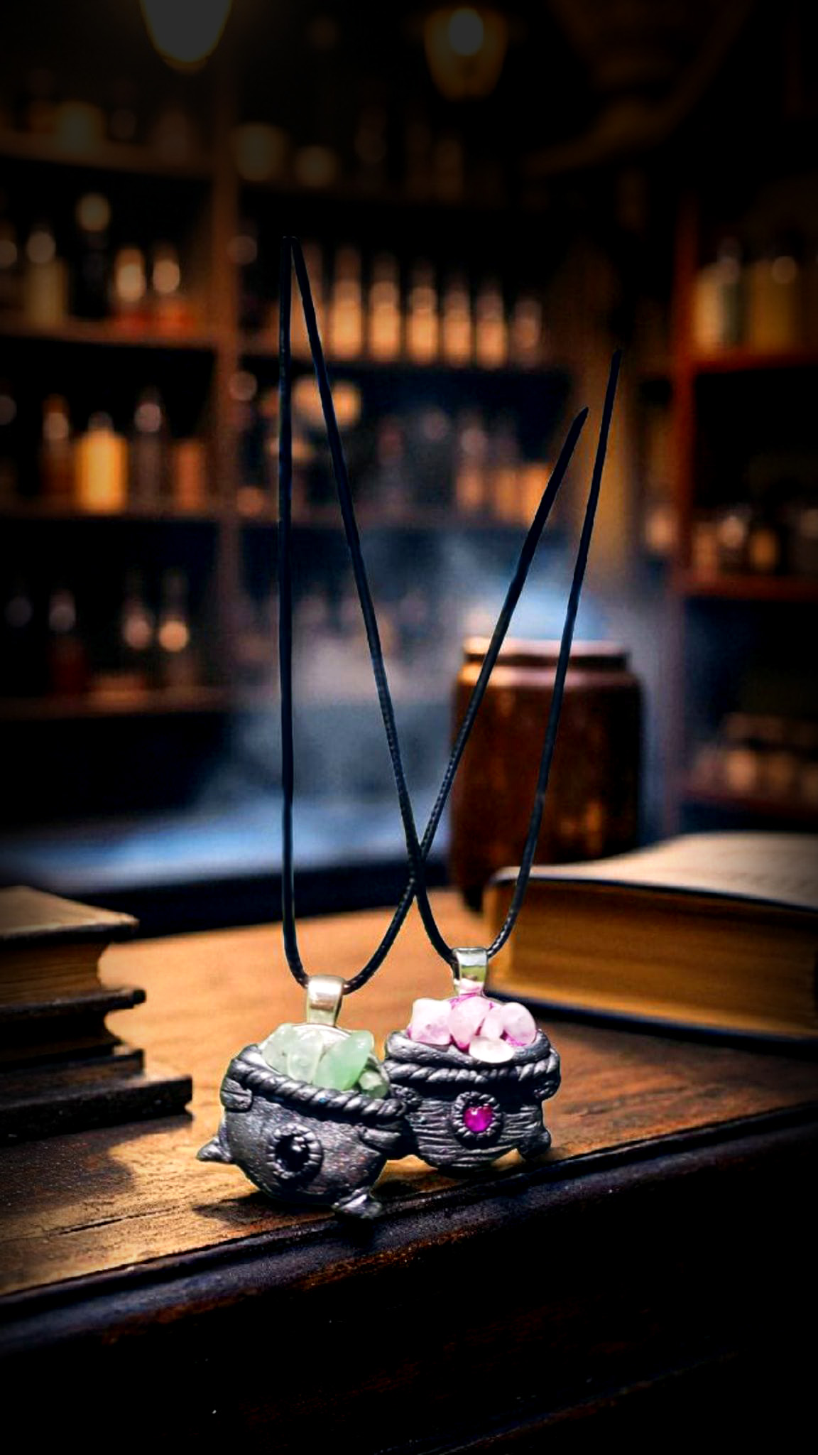 Na krk si můžete pověsit malé kouzelné talismany – od čarodějnických kotlíků, lektvarů a kouzelnických kamenů až po miniaturní baňky, nádobky a mnoho dalších ručně tvarovaných předmětů, které v sobě nesou kousek magického světa.